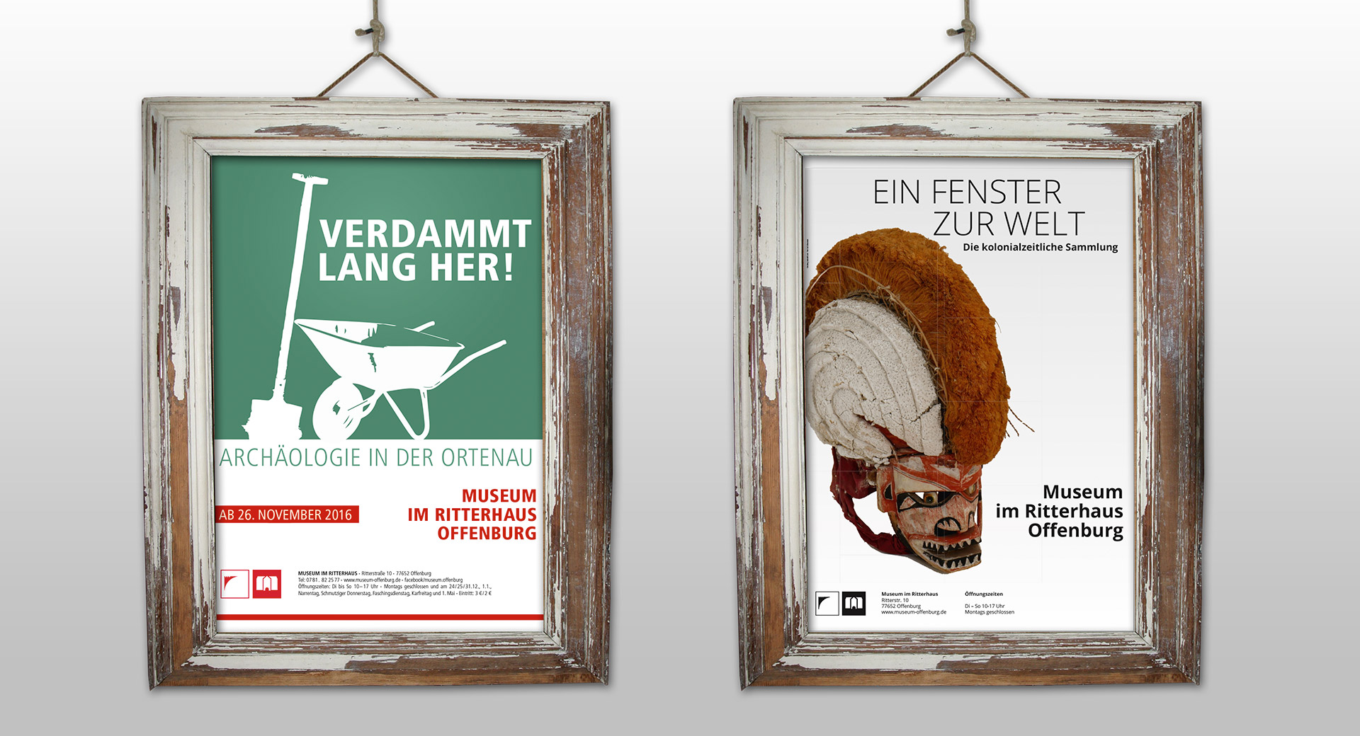 Für die Dauerausstellungen "Verdammt lang her" und "Ein Fenster zur Welt" sind Plakate, Großformatbanner und Werbemittel wie Anzeigen, Einladungskarten, Flyer und digitale On-Screen-Anzeigen entstanden. Die Gestaltung greift das jeweilige grafische Konzept der Ausstellung auf und macht diese im öffentlichen Raum sichtbar.