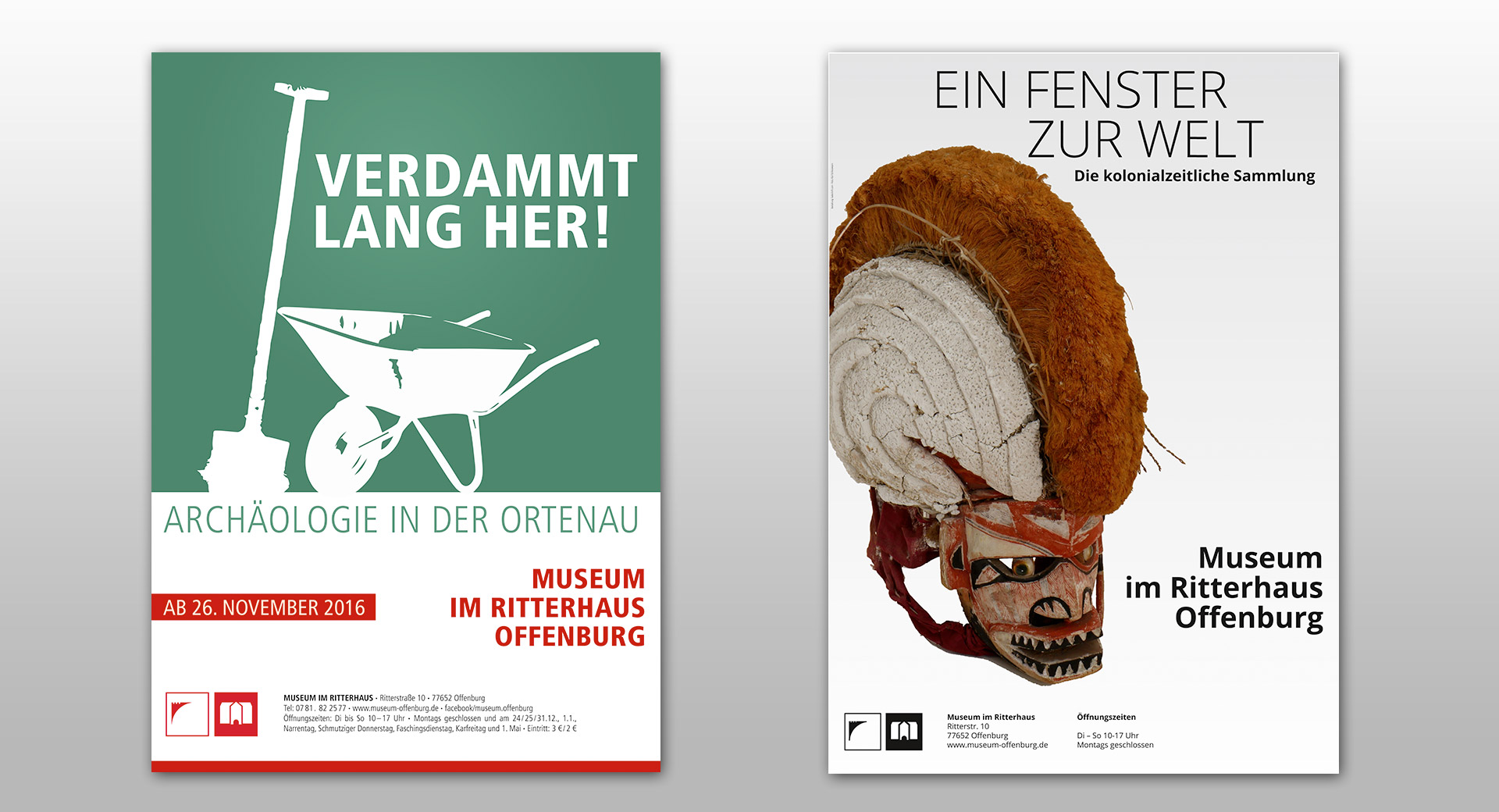 Für die Dauerausstellungen "Verdammt lang her" und "Ein Fenster zur Welt" sind Plakate, Großformatbanner und Werbemittel wie Anzeigen, Einladungskarten, Flyer und digitale On-Screen-Anzeigen entstanden. Die Gestaltung greift das jeweilige grafische Konzept der Ausstellung auf und macht diese im öffentlichen Raum sichtbar.